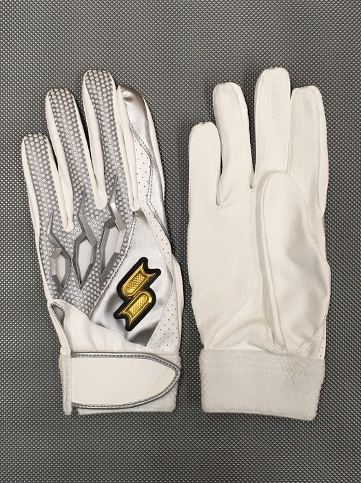 合成皮革の裏側に滑り止め加工を施し、手の滑りが緩和され、一体感が増しました。ハイグリップタイヤの溝をモチーフにしたエンボスパターンを掌部に採用。 手とバットの密着感を高め、グリップ力を生み出します。