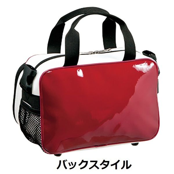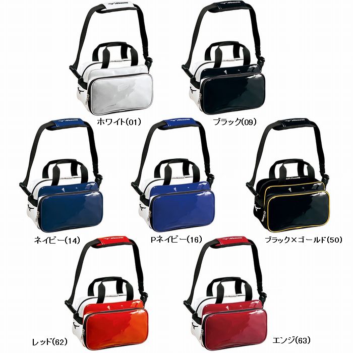 ミズノ(MIZUNO) ミニバッグ 品番:1FJD4026 カラー:ホワイト(01)、ブラック(09)、ネイビー(14)、パステルネイビー(16) ブラック×ゴールド(50)、レッド(62)、エンジ(63) 素材:合成皮革(PUエナメル) サイズ:L26×W12×H17 容量:約5L フロントポケット取り外し式(縦13×横26cm) 原産国:ベトナム製