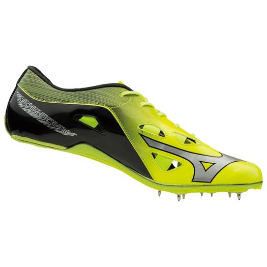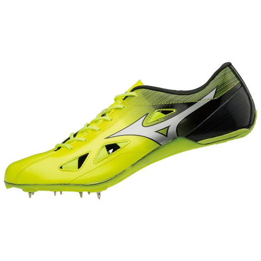 品番:U1GA1812 カラー:09(イエロー×シルバー×ブラック) サイズ:22.5〜28.5cm 質量:170g(26.0cm片方) 甲材:合成繊維、人工皮革 底材:合成底 スパイクピン:8ZA303(8mm)、固定式(6mm・4mm) レンチ:8ZA309 競技種目:100〜400m、ハードル(オールウェザートラック専用) 付属品:シューズ袋(ベトナム製)付 原産国:ベトナム製
