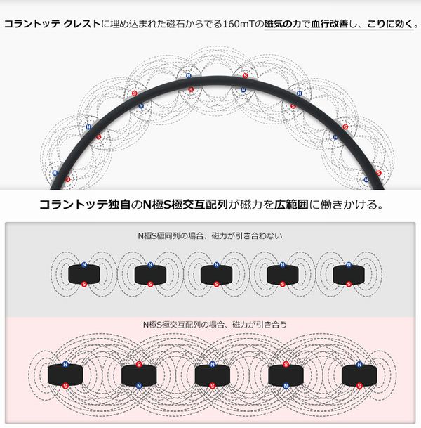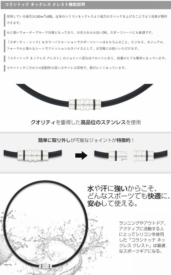 コラントッテ(colantotte) ネックレス クレストプレミアム 品番:ABAAS5 品番:90(プレミアムブラック) サイズ:S(43cm)、M(47cm)、L(51cm) 素材 本体:シリコン・希土類磁石 ジョイント:ステンレス 磁石:希土類永久磁石160mT(1600G)8個をN極S極交互配列 仕様:男女兼用 生産国:日本 医療機器承認番号:226AGBZX00054000