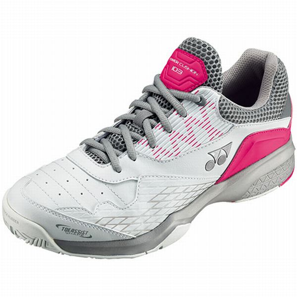 ヨネックス(YONEX) テニスシューズ パワークッション103 品番:SHT103 カラー(062)ホワイト/ピンク サイズ:22.0〜28.0cm 素材 アッパー:人工皮革 ミッドソール:合成樹脂 アウトソール:ゴム底 仕様:クレー/砂入り人工芝コート 特徴:ローカット、3E 生産国:インドネシア