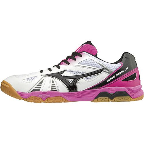 ミズノ(MIZUNO) 卓球シューズ ウエーブメダル 5 品番:81GA151560 カラー:ホワイト×ブラック×ピンク(60) サイズ:22.5〜28.5cm 甲材:人工皮革・合成繊維 底材:合成底 質量:約265g(26.0cm片方) インソール:マイルドクッションインソール(取り外し可) ウィズ:2E相当の方向け 原産国:ベトナム
