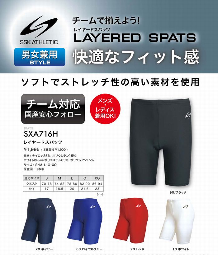 エスエスケイ(SSK) インナーパンツ レイヤードスパッツ 品番:SXA716H カラー:(10)ホワイト サイズ:S・M・L・O・XO 素材:ポリエステル85%・ポリウレタン15% 股下:19cm(L) ・吸水速乾素材、紫外線カット、水陸両用と多機能素材を使用 ・少しゆるめのサイズ設計は締め付けすぎず、運動時の動きやすさを追及 ・着心地と品質にこだわったソフトコンプレッションウェア ・ソフトでストレッチ性の高い素材を採用 ・少しゆるめのサイズ設計で占めつきすぎない ・UPF50+素材で紫外線を徹底カット ・水陸両用素材を使用 生産国:日本製