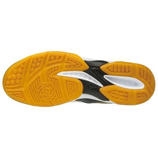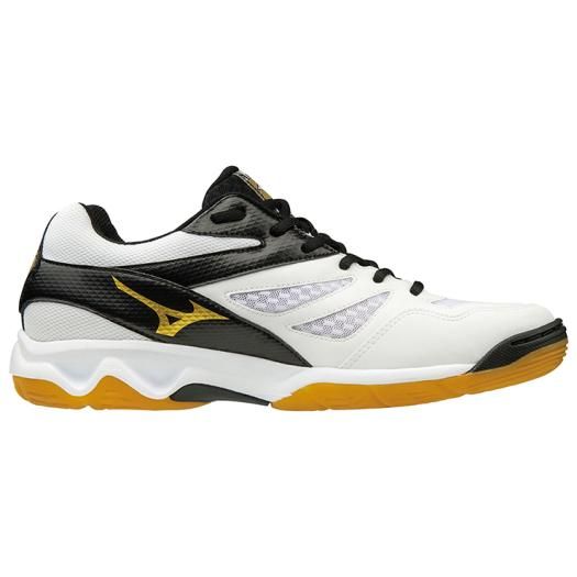 ミズノ(MIZUNO) バレーボールシューズ サンダーブレード 品番:V1GA177009 カラー:09:ホワイト×ブラック×ゴールド サイズ:22.5〜30.0cm 素材 甲材:合成繊維、人工皮革 底材:合成底 質量:約295g(27.0cm片方) インソール:取り外し不可 3E相当の方向け 軽量インジェクションミッドソール コンフォートラスト外し不可 原産国:インドネシア製