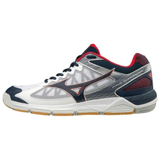 ミズノ(MIZUNO) バレーボールシューズ ウエーブスーパーソニック 品番:V1GA184014 カラー:14:ホワイト×ネイビー×レッド サイズ:23.0〜30.0cm 素材 甲材:合成繊維、人工皮革 底材:合成底 質量:約300g(27.0cm片方) インソール:取り外し可 2E相当の方向け 原産国:ベトナム製