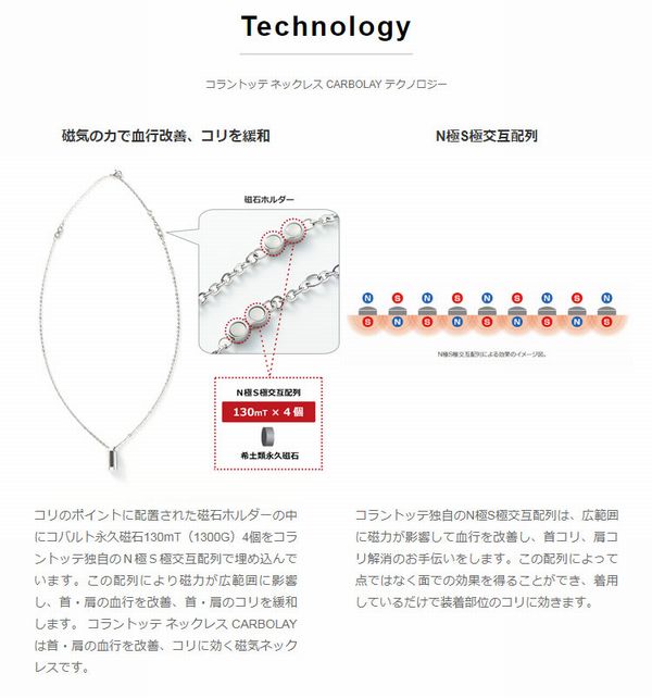 コラントッテ(Colantotte) ネックレス CARBOLAY 品番:ABAPQ カラー:シルバー 医療機器認証番号:222AGBZX00052A02 適応サイズ:フリーサイズ(47cm・51cm/サイズ調整用丸カン1個付) 材質:【チェーン・フック・丸カン】ステンレス(SUS316L) 【磁石パーツ】希土類永久磁石、ステンレス(SUS316L)、エポキシ樹脂 【ペンダントトップ】ステンレス(SUS316L)、カーボン、エポキシ樹脂、ゲルマニウム 磁石:希土類永久磁石130mT(1300G) 4個をN極S極交互配列