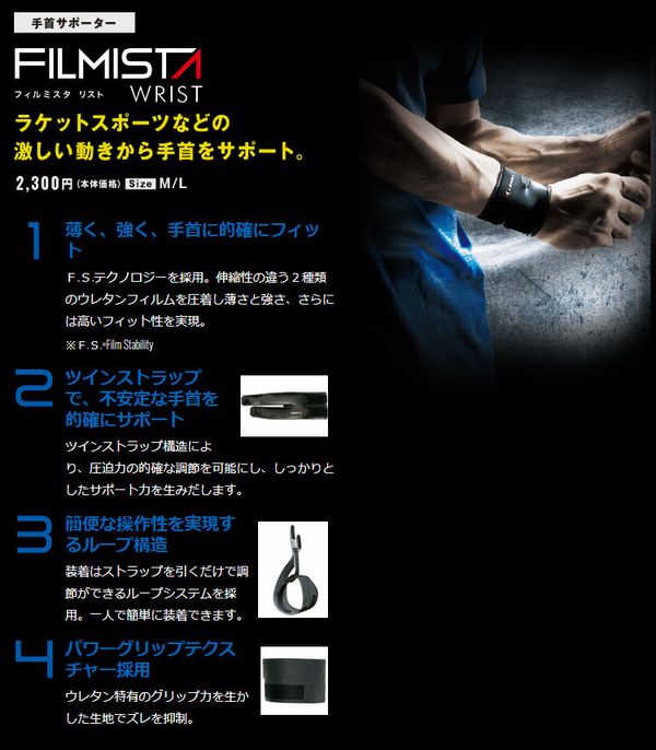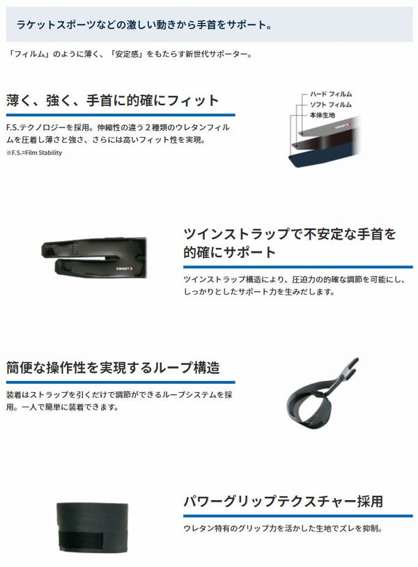 ラケットスポーツなどの激しい動きから手首をサポート。 「フィルム」のように薄く、「安定感」をもたらす新世代サポーター。