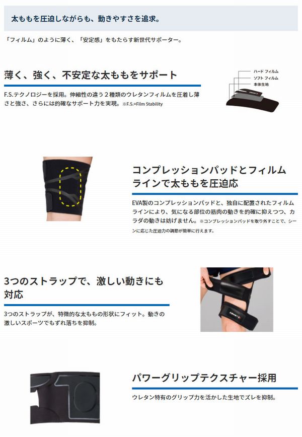 太ももを圧迫しながらも、動きやすさを追求。 「フィルム」のように薄く、「安定感」をもたらす新世代サポーター。
