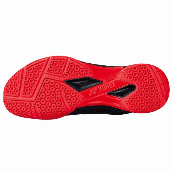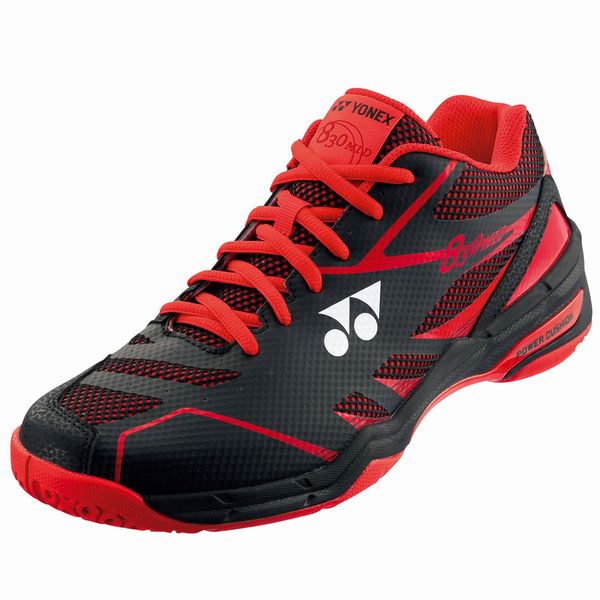 ヨネックス(YONEX) バドミントンシューズ パワークッション830ミッド 品番:SHB830MD カラー:ブラック/レッド(187) サイズ:22.0〜29.0cm 素材 アッパー:合成繊維 ミッドソール:合成樹脂 アウトソール:ゴム底 備考:ミッドカット、3E設計 テクノロジー:パワークッション、デュラブルスキンライト、ラウンドソール、トウアシストシェイプ 原産国:中国