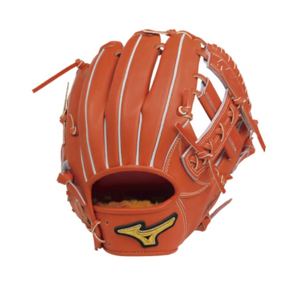 品番:1AJGH19013 カラー:スプレンディッドオレンジ(52) 素材:受球面・背面・平裏:ジェネラルキップレザー(天然皮革:牛革) サイズ:9 ポジション:内野手用 左右:右投げ用 仕様:HAGA JAPAN・Dlink構造・BSSショップ限定ミズノプロマーク・指カバー付 付属品:専用袋付き 原産国:日本製