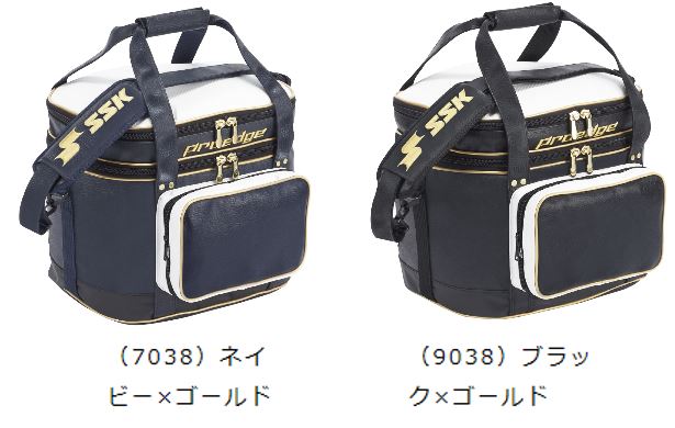 エスエスケイ(SSK)プロエッジ ボールバック 品番:EBH2000 カラー 7038:ネイビー×ゴールド 9038:ブラック×ゴールド サイズ 本体:長さ40×高さ32×幅31cm(容量:約43L) 前ポケット:縦18×横27cm 素材:合成皮革(PVC) 仕様 前ポケット脱着式 硬式・軟式:5ダース用ソフトボール:2.5ダース用 生産国:中国