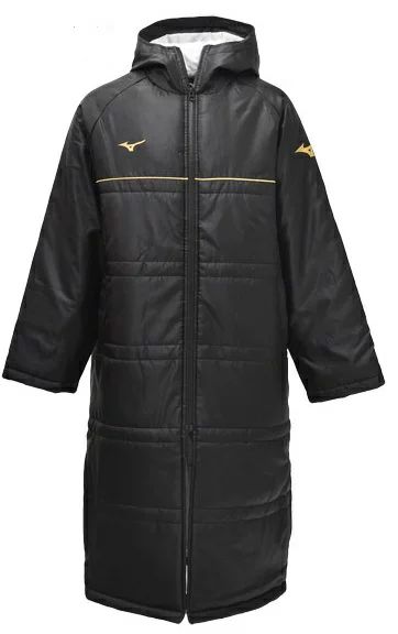 ミズノ(MIZUNO) オリジナル ロングベンチコート 品番:32JEE85009 カラー:09:ブラック×ゴールド サイズ:M・L・XL 素材 表地:ポリエステル 100% 裏地:ポリエステル 100% 中綿:ポリエステル 100%