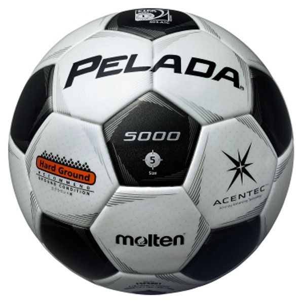 モルテン(molten) サッカーボール5号球 ペレーダ5000 土用 品番:F5P5001 カラー:シャンパンシルバー×メタリックブラック 素材:アセンテック・人工皮革 国際公認球、検定球 サイズ:5号球 土グラウンド用 砂防止バルブ 生産国:タイ プチルチューブ *このボールはたたんだ状態で保管・輸送をしますと、空気を入れた後も表皮にシワが残ります。空気を入れた状態で保管・輸送をお願いします。 人工芝で使用した場合は耐久性が低下する可能性があります。