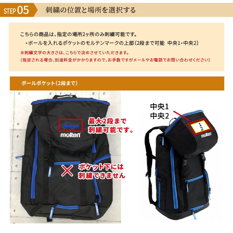 モルテン(molten) バックパック サッカー用 40? 品番:LF0013 カラー:黒×青 素材:ナイロン サイズ:幅35×高さ54×奥行20cm 40リットル容量(ボール収納部を除く) ボール収容ネット付き ボール(5号)2個、スパイク(28cmまで)、シンガード、ウェアが収納可 中国製