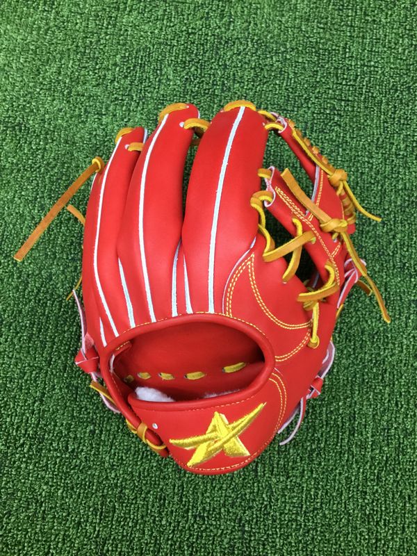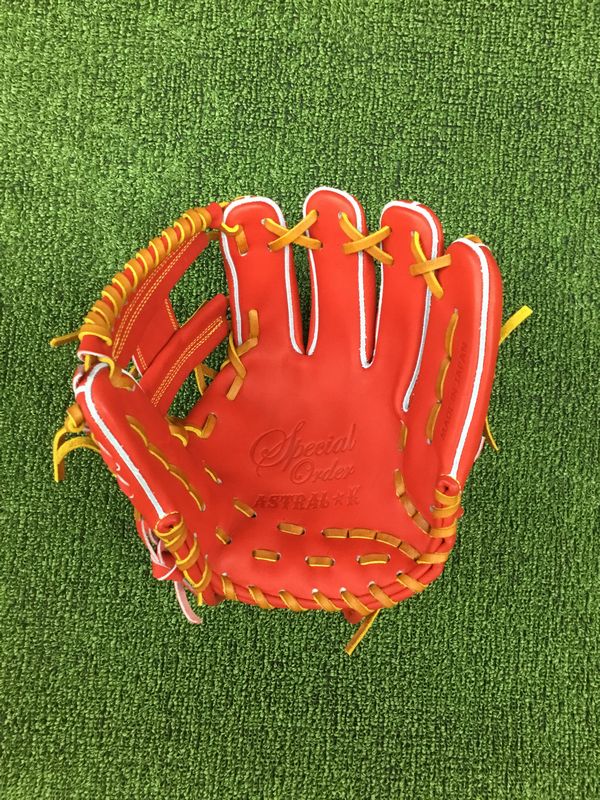 ASTRAL K 硬式用内野手グラブ 品番:AGL401 カラー 本体:レッドオレンジ(22) 裏平革:レッドオレンジ(22) レースカラー:コルク(27) 縫い糸:イエロー(15) ラベル:直接刺繍 ゴールドラメ×シャンパンゴールド サイズ:LH(右投用) 素材 表:天然皮革(High Leather) 平裏:天然皮革(High Leather) ウェブ:W-11(内野手用) 付属品:専用袋 生産国:日本