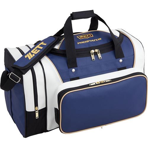 ゼット(ZETT) プロステイタス ミドルバッグ 品番:BAP617 カラー:ブロンズブルー×ホワイト(2011) 素材:合成皮革(PVC)、底部・背面/1680Dナイロン サイズ:高さ55×高さ33×巾26cm 容量:約51L(本体/約40L+ポケット/約11L) 機能・特徴 ・フロントポケット前面生地取り外し式(縦20×横38cm) ・フロントポケット内マルチポケット付き ・左サイドポケット付き ・本体内側右仕切りポケット付き 原産国:中国