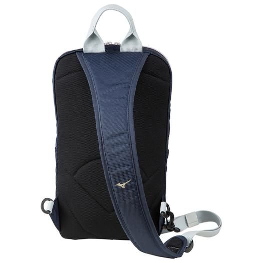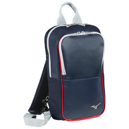 ミズノ(MIZUNO) ボディーバッグ 品番:1FJD942181 カラー:81:ネイビー×レッド サイズ:L19×W9×H35cm 素材:合成皮革(PU)・ナイロン(裏加工PU) 容量:約5L 原産国:ベトナム製