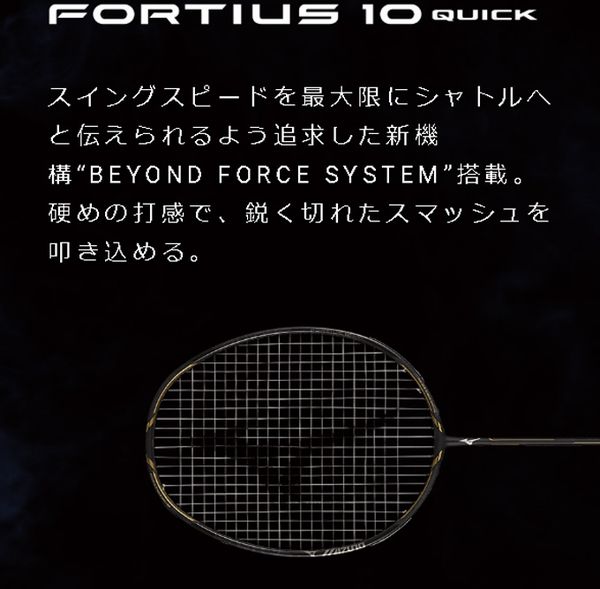 ミズノ(MIZUNO) バドミントンラケット フォルティウス10クイック FORTIUS 10QUICK 品番:73JTB90309 カラー:09:ブラック×ゴールド サイズ:4U5 素材:高弾性グラファイト+グラファイト、MFUSION 全長:675mm 面サイズ:56inch2 推奨張力:23~27lbs フレーム、ポータブルケース 原産国:日本製