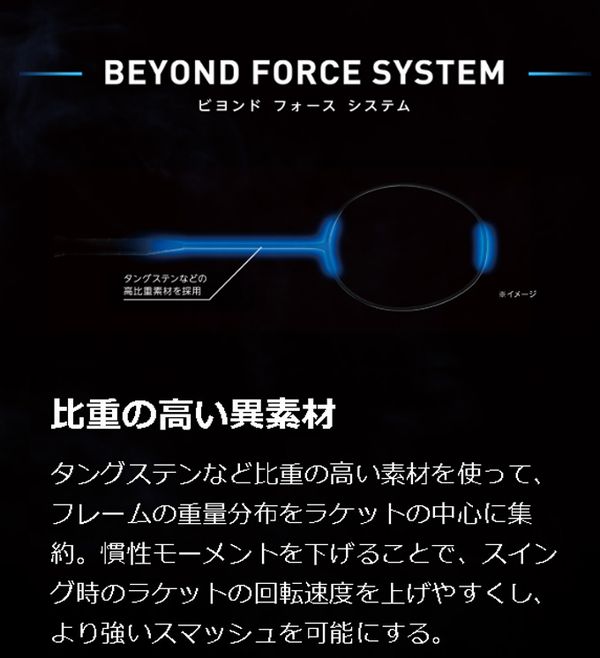 スイングスピードを最大限にシャトルへと伝える新機能“BEYOND FORCE SYSTEM”搭載。 力強いスマッシュが可能。