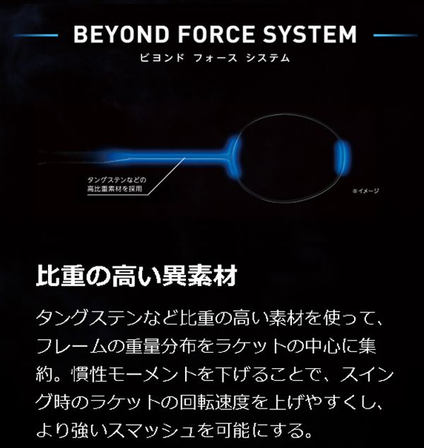 スイングスピードを最大限にシャトルへと伝える新機能“BEYOND FORCE SYSTEM”搭載。 より強く、パワースマッシュ。