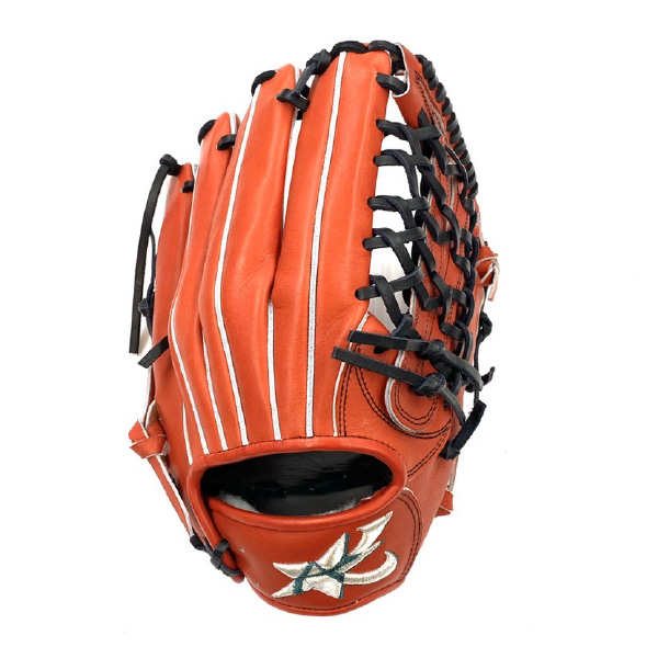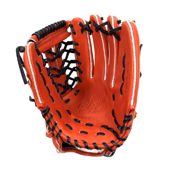 ASTRAL K 硬式用外野手グラブ 品番:AST801 カラー 本体:レッドオレンジ(22) 裏平革:レッドオレンジ(22) レースカラー:ブラック(90) 縫い糸:ブラック(90) マーク(直刺繍):シルバー×影クロームグリーンラメ サイズ:LH(右投用) 素材 表:天然皮革(High Leather) 平裏:天然皮革(High Leather) ウェブ:W-20(外野手用) 付属品:専用袋 生産国:日本