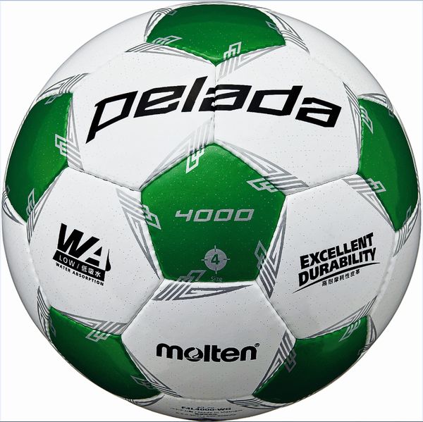 モルテン(molten) サッカーボール4号球 ペレーダ4000 品番:F4L4000WG カラー:WG:ホワイト×メタリックグリーン サイズ:4号球 素材:人工皮革、縫い チューブ素材:ブチルゴム 用途(コートサーフェス):土 特徴 縫い・人工皮革 砂防止バルブ 検定球 生産国:中国製・ベトナム製