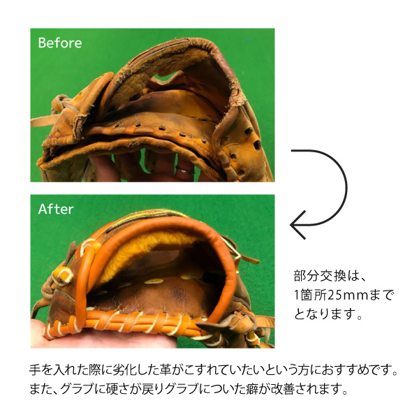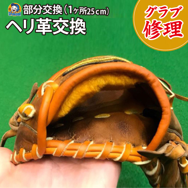 ■品名:【グラブ修理】 ヘリ革交換 〜部分交換〜 ■商品説明:手を入れた際に劣化した革がこすれていたいという方におすすめです。 また、グラブに硬さが戻りグラブについた癖が改善されます。