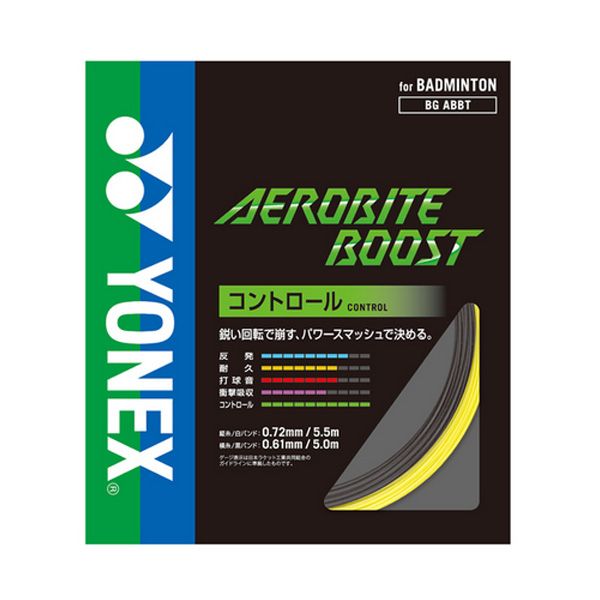 ヨネックス(YONEX) バドミントンガット エアロバイトブースト(AEROBITE BOOST) 品番:BGABBT カラー:グレー/イエロー(815) ゲージ:縦糸(白バンド):0.72(mm)、横糸(黒バンド):0.61(mm) 長さ:縦糸(白バンド)/5.5m、横糸(黒バンド)/5m 素材:マルチフィラメント [縦糸] 芯糸:高強度ナイロン+ベクトラン 側糸:楕円形ハイポリマーナイロン(ブレーディング加工) PUコーティング [横糸] 芯糸:高強度ナイロン 側糸:ハイポリマーナイロン(ブレーディング加工) 原産国日本製