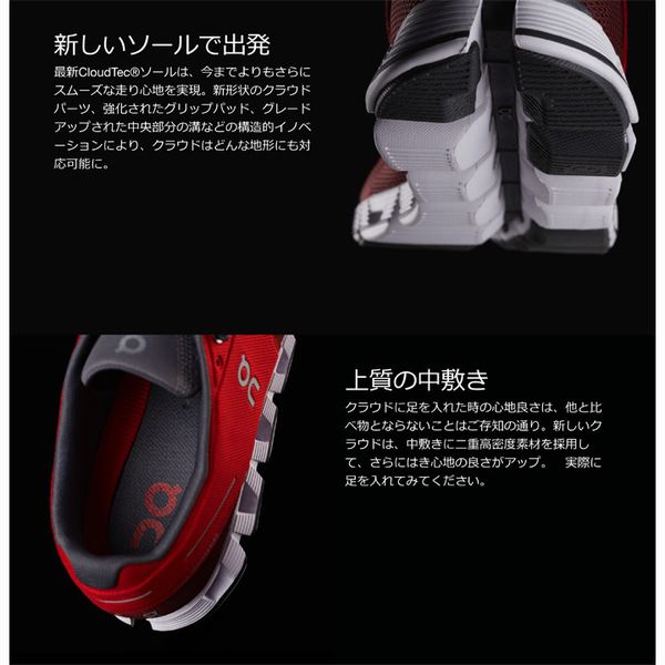 オン(On) ランニングシューズ Cloud クラウド 品番:190000M カラー:ブラック×ホワイト サイズ:25.0~29.0cm アウトソール:CloudTec 質量:約230g(26.5cm片足) 足幅:メンズD 特徴・機能 【新しいソールで出発】 最新CloudTecソールは、今までよりもさらにスムーズな走り心地を実現。 新形状のクラウドパーツ、強化されたグリップパッド、グレードアップされた中央部分の溝などの 構造的イノベーションにより、クラウドはどんな地形にも対応可能に。 【上質の中敷き】 クラウドに足を入れた時の心地良さは、他と比べ物とならないことはご存知の通り。 新しいクラウドは、中敷きに二重高密度素材を採用して、さらにはき心地の良さがアップ。 実際に足を入れてみてください。 【踵からつま先まで、快適にパフォーマンス向上】 新しいV字型の踵は、足に合うようにマテリアルデザインと形状の最先端技術を採用。 ぴったりとフィットしながら、足を自由に動かすことができます。 【はきやすいOn】 クラウドの象徴的なアイテムであるイージー・エントリー・スピード・シューレースシステム。 足をクラウドに滑り込ませるだけで、シューレースを結ばずに走っても、脱げません。 磨きぬかれたスイス・エンジニアリング。