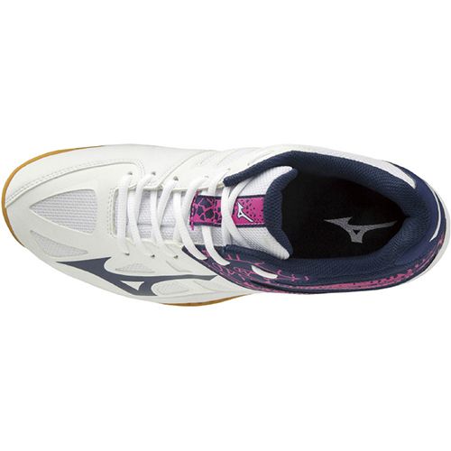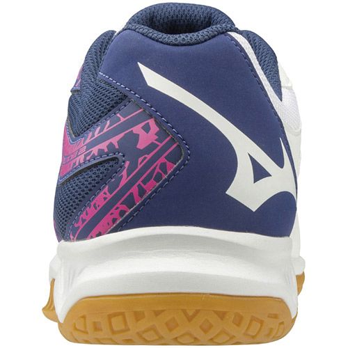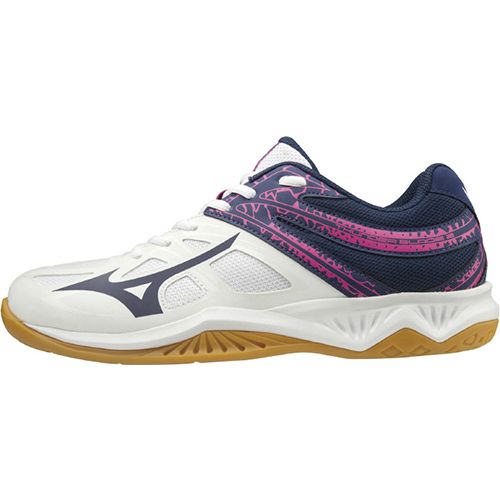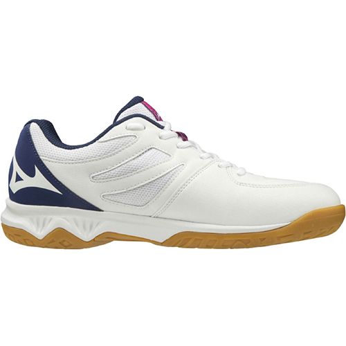 ミズノ(MIZUNO) バレーボールシューズ サンダーブレード2 品番:V1GA197013 カラー:ホワイト×ネイビー×ピンク(13) サイズ:22.5~26.5cm 甲材:人工皮革・合成繊維 底材:合成底 質量:約310g(27.0cm片方) インソール:取り外し可 足幅:2.5E相当の方向け 生産国:ベトナム